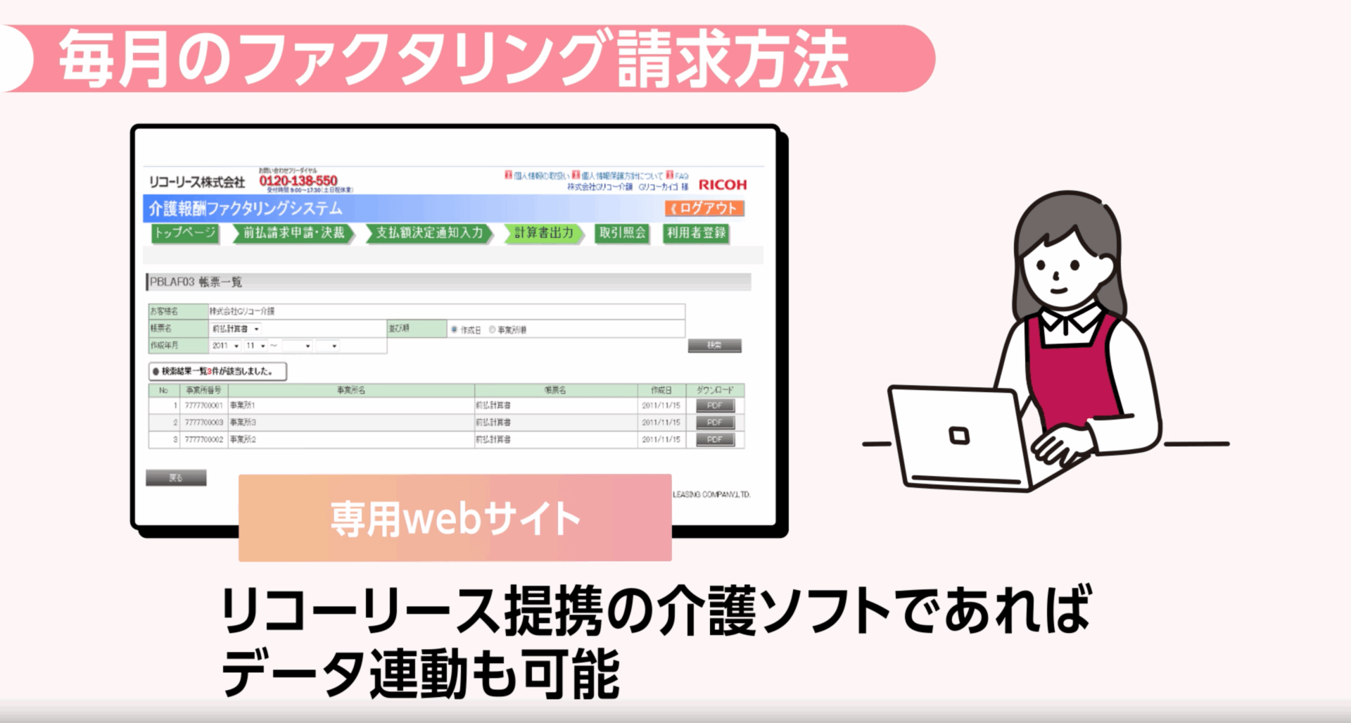 今後、業務効率化のために介護ソフトを変更する予定がある場合でも、リコーリースのサービスなら柔軟に対応できます。現場のオペレーションを変えることなく、資金調達の仕組みだけをスムーズに組み込める利便性の高さは、多忙な介護現場において大きな安心につながるでしょう。